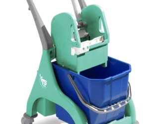 Fahreimer mit farbigen Grundgestell und Tec Presse, blauem Eimer und ø 80 mm Lenkrollen mit Stoßschutz